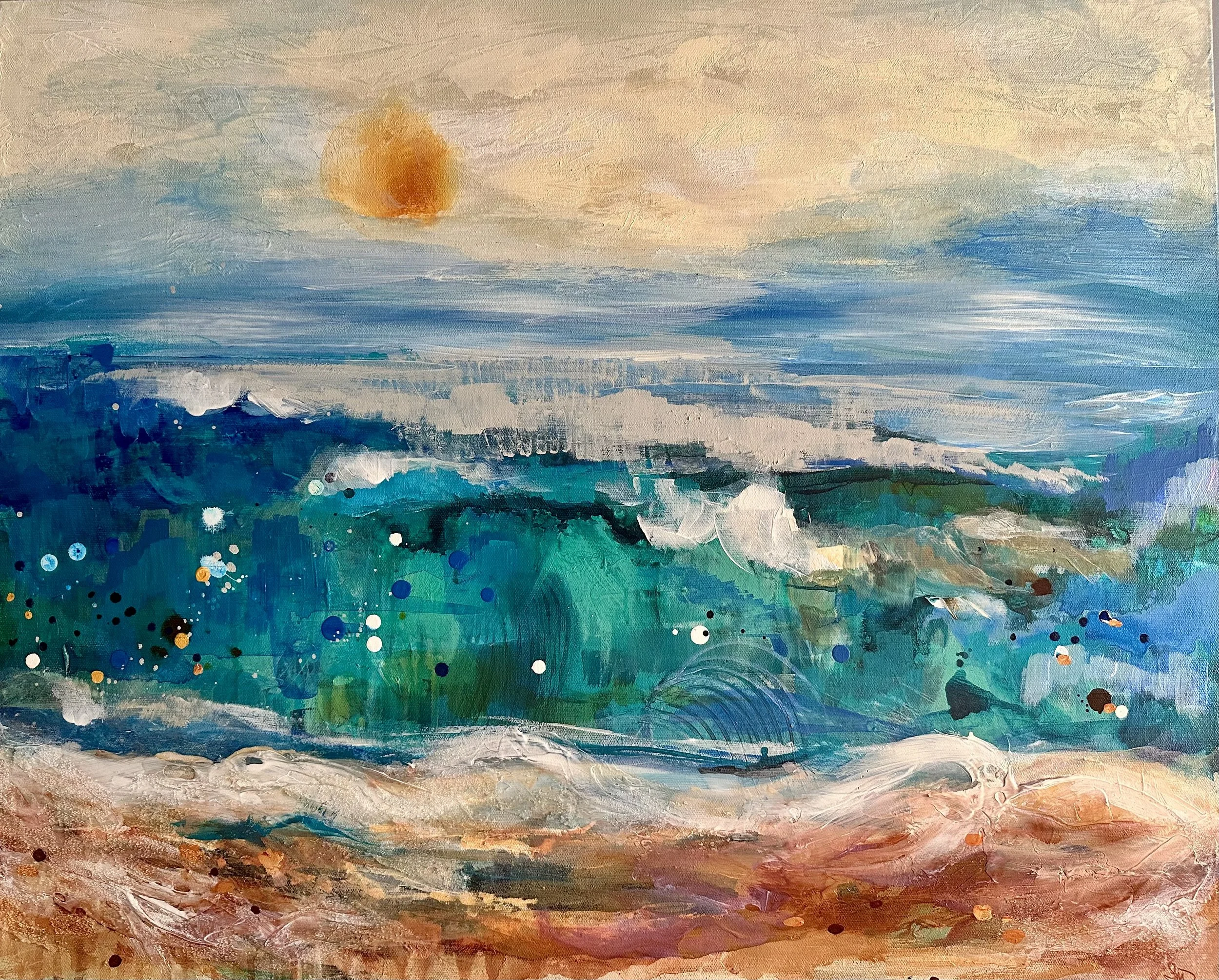 My family loves to take time to visit the shores of Corolla, NC. As the ocean becomes rough, it makes gorgeous waves, and this acrylic painting captures that. It is made with glass bead gel, iridescent hues, ink, drippy acrylic paint. The 24X30 size fits in most spaces, not too large but a perfect fit.
